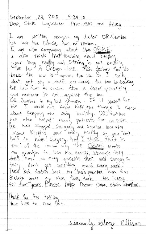 The board has ignored this change in the law. There are several doctors in the state who agree with what he has done. The board has never accused Dr. Gambee of harming anyone, nor has there ever been a patient complaint of being harmed in over 30 years of practicing medicine in Oregon.